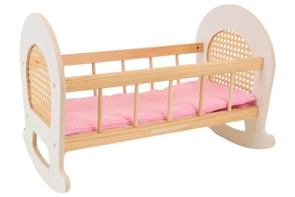 Für Liebhaber nostalgischer Korbpuppenwagen bietet die Serie von Bandits & Angels ebenfalls passende Modelle. Die Körbe sind aus Rattan gefertigt und verleihen den Puppenwagen einen charmanten Vintage-Touch. Die Verbindung von Holzgestell und Rattankorb schafft eine harmonische Ästhetik.