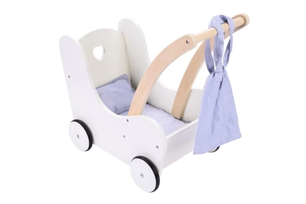 Ein Puppenwagen aus weiß Holz, mit natürlichem Griff. Die Räder sind ebenfalls aus Holz, aber mit einem Gummireifen ausgestattet. Dadurch machen sie wenig Geräusche und können sowohl drinnen als auch draußen gefahren werden. Der Puppenwagen wird mit rosa Bettwäsche und einer passenden rosa Aufbewahrungstasche geliefert! Der Puppenwagen misst 57x23,5x45 cm und ist für Kinder ab 3 Jahren geeignet.